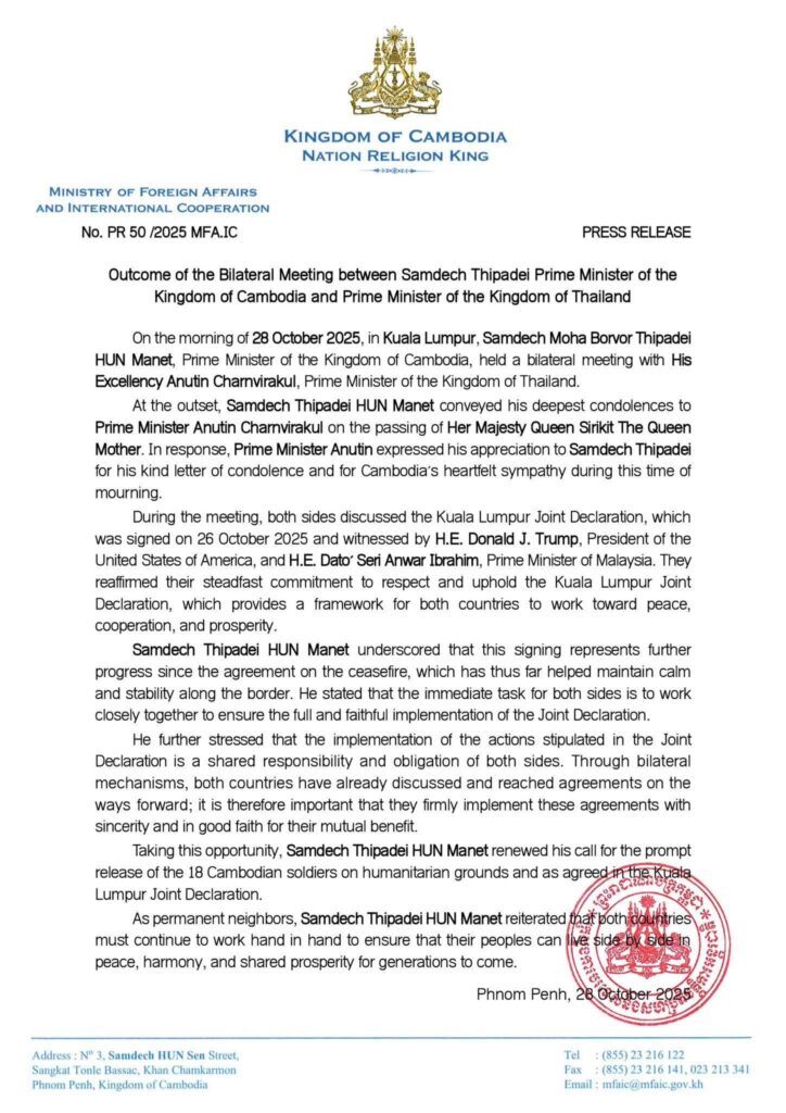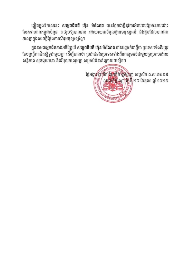 ថ្ងៃទី២៨ ខែតុលា ឆ្នាំ២០២៥ លទ្ធផលនៃជំនួបទ្វេភាគីរវាងសម្ដេចបវរធិបតីនាយករដ្ឋមន្ត្រីនៃព្រះរាជាណាចក្រកម្ពុជា និងនាយករដ្ឋមន្ត្រី នៃព្រះរាជាណាចក្រថៃ ដែលក្នុងនោះផងដែរ សម្តេចបវរធិបតី ហ៊ុន ម៉ាណែត បានរំឭកជាថ្មីនូវការអំពាវណាវអោយមានការដោះលែងទាហានកម្ពុជាទាំង១៨ រូបឲបានឆាប់ ៕