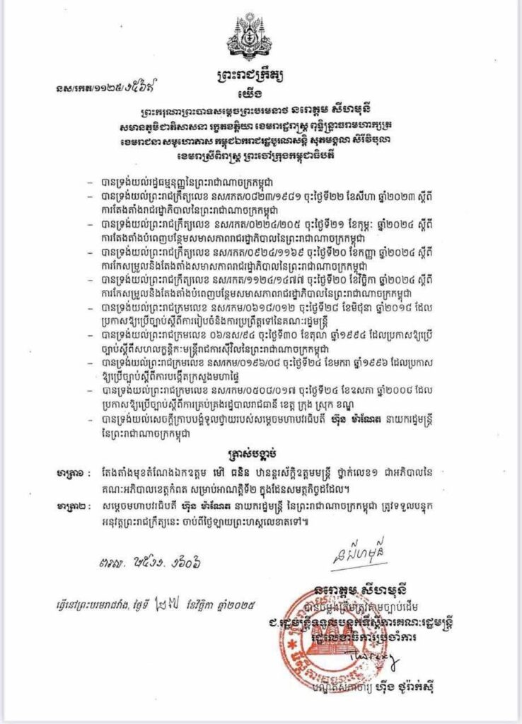 ព្រះរាជក្រឹត្យត្រាស់បង្គាប់ តែងតាំងមុខតំណែងឯកឧត្តម ម៉ៅ ធនិន ឋានន្តរស័ក្តិឧត្តមមន្ត្រី ថ្នាក់លេខ១ ជាអភិបាលនៃគណៈអភិបាលខេត្តកំពត សម្រាប់អាណត្តិទី២